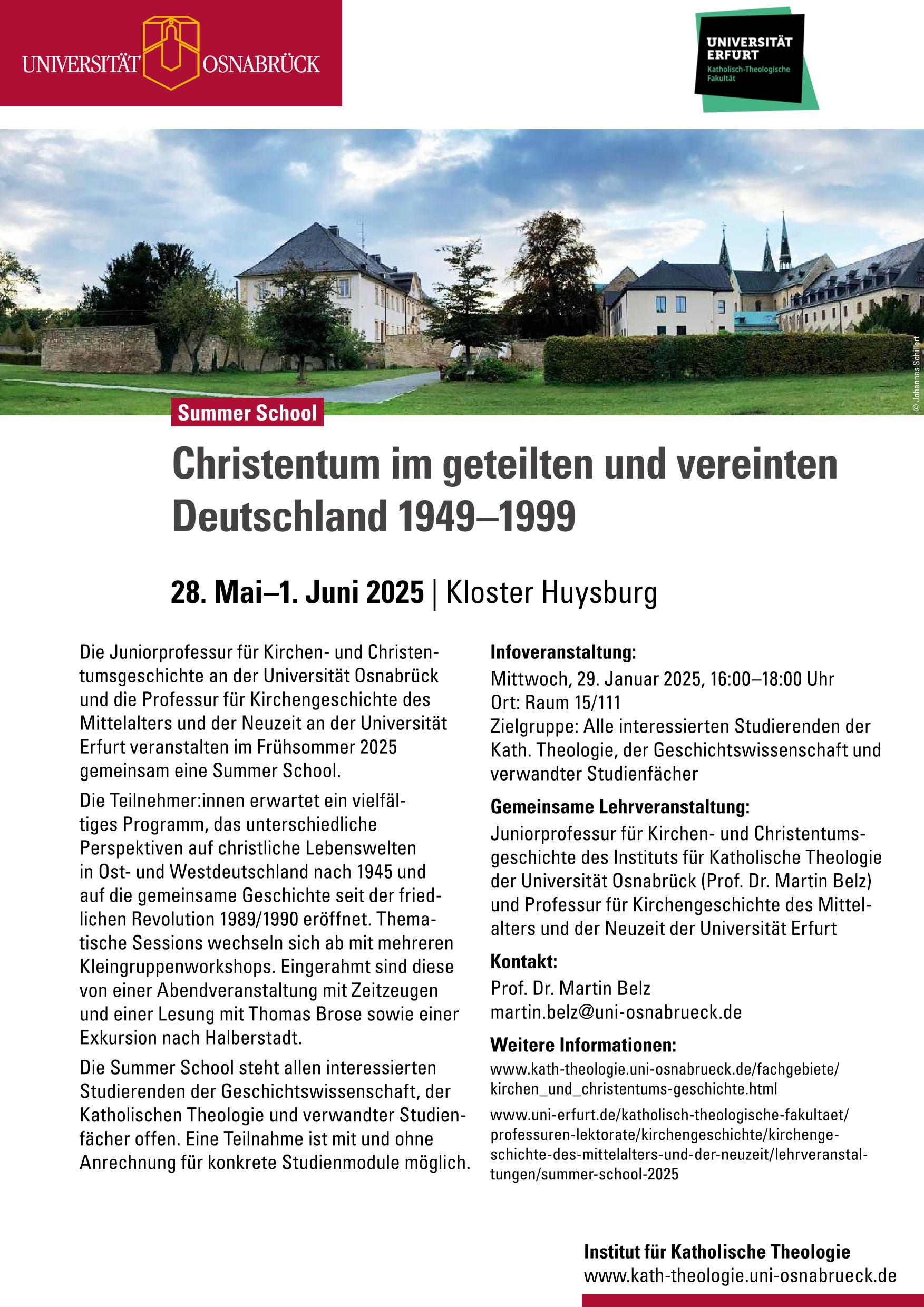Die Juniorprofessur für Kirchen- und Christentumsgeschichte an der Universität Osnabrück und die Professur für Kirchengeschichte des Mittelalters und der Neuzeit an der Universität Erfurt veranstalten im Frühsommer 2025 gemeinsam eine Summer School zum Thema